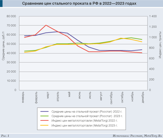 По данным ж/д статистики, в 2023 году произошел существенный рост (+11,9%) внутрироссийских поставок всех видов готового стального проката. При этом самым принципиальным для финансовых показателей металлургии является уровень цен этих продаж (рис. 1).