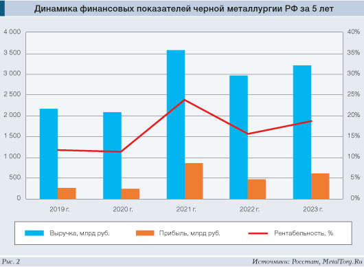 С другой стороны, надо отметить невольную поддержку металлургов со стороны сырьевых отраслей. По данным Росстата, среднегодовые цены на железорудный концентрат в РФ выросли ниже инфляции (+3,1% в годовом сравнении), а на коксующийся уголь – даже снизились на 19,1%. Под влиянием жестких ограничений на экспорт остались сравнительно низкими и российские цены на черный лом. Итог – сравнительно низкая себестоимость металлопродукции на фоне почти стабильных среднегодовых цен ее продаж. Более того, внутренние российские цены были неожиданно лучше экспортных (не для покупателей, конечно). Следствие – рост рентабельности и финансовых показателей черной металлургии РФ по итогам 2023 года (рис. 2).
