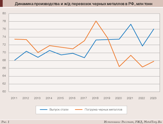 В опубликованных итогах работы ОАО «РЖД» за 2023 год отмечалось, что в развитии этой компании одним из самых позитивных моментов была динамика перевозок черных металлов. Их погрузка за год выросла на 2,3%, до 67,8 млн т, притом что общая погрузка на российских железных дорогах снизилась за год на 0,2%, до 1,23 млрд т. Доля металлов, превысившая 5%, кажется не слишком высокой и в разы уступает ж/д перевозкам угля и нефтепродуктов. Однако с учетом металлургического сырья (коксующегося угля, кокса, руды и металлолома) она превышает 300 млн т и приближается к трети общего объема ж/д грузоперевозок в РФ.