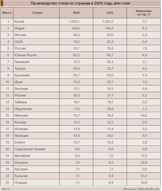 В региональном разрезе за 2024 год наибольший рост этой отрасли отмечается в группе развивающихся стран (Индия, Турция, Вьетнам), некоторое восстановление производства – в странах Евросоюза (+2,6%). Однако у некогда признанных авторитетов – Японии, США, Южной Кореи – существенный спад. Более детальная статистика выпуска стали по странам – ее основным производителям приведена в табл. 1.