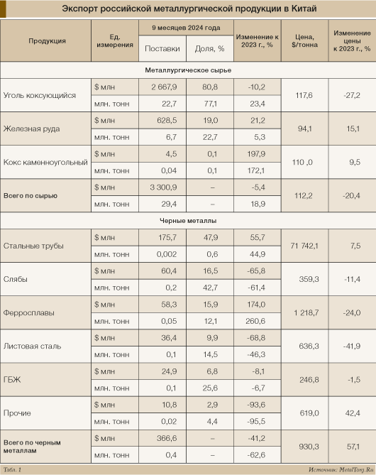 Динамика и состав российского металлургического экспорта в КНР за 9 месяцев 2024 года представлена в табл. 1.
