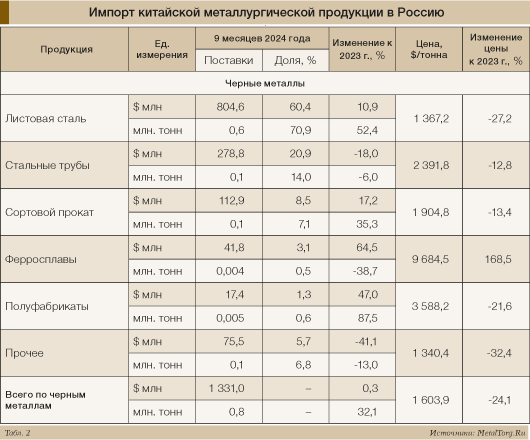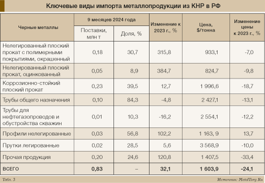 Отметим также присутствие в российском экспорте 2024 года в Китай продукции с незначительными и эпизодическими поставками: это горячебрикетированное железо (средняя цена $247 за т), непрерывнолитая квадратная стальная заготовка ($468 за т), передельный чугун с низким содержанием марганца и фосфора ($476 за т).
