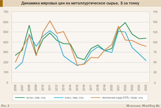 Рынок чугуна традиционно был весьма инерционен. Однако в последние десятилетия стабильности его цен и грузопотоков становится все меньше. Начиная с резкого скачка цен в 2008 году, связанного с общемировым кризисом, перегруженностью бразильских портов, стремительным ростом фрахтовых ставок и цен на сырье, стоимость чугуна почти два десятилетия колеблется в крайне широком интервале – от $250 до $600 за т. Хотя основными причинами для этих колебаний принято называть не кризисы, а только цены на сырье – железную руду и кокс (рис. 1).