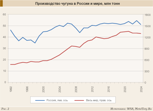 Также в последнее время существенно поменялась география как производства, так и торговли чугуном. В роли крупнейшего производителя в мире, с долей более 65% глобального выпуска чугуна, закрепился Китай. За 2024 год, по оценке ассоциации WorldSteel, при мировом производстве на уровне 1,294 млрд т (-1,3%) китайская выплавка чугуна составила 852 млн т. Намного меньше (90 млн ... ... ...