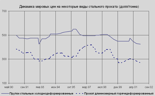 Начинался этот кризис в начале прошлого года глобальным перепроизводством стали, избыточные мощности при этом по оценкам различных экспертов составили величину от 100 до 300 млн. тонн. Кроме того, неукоснительно снижалось видимое потребление стали и сталепродуктов в мире, связанное с охлаждением мировых экономик и, прежде всего, американской. Производители, не желая терять объемы производства, стали демпинговать, и это еще сильнее подорвало мировой рынок: цены достигли своих минимальных значений за последние несколько лет (график 1). Опускаться ниже означало существенно сокращать издержки, в основном за счет сокращения избыточных мощностей и массовых увольнений сотрудников, чего не могли допус ... ... ...