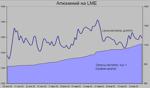 Тем не менее, такое снижение производства, плавно происходившего весь год, способствовало задержке дальнейшего снижения цены, а уверенная стабилизация произошла лишь в самом конце 2001 года. Всего за год общее предложение алюминия достигло рекордных отметок, составив в конце года рост по сравнению с предыдущим более чем в 1.8 раза, достигнув уровня в 1 млн. тонн.