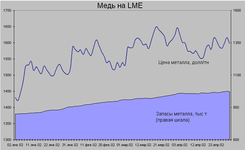 В целом на рынке меди наблюдалась ситуация похожая на рынок алюминия. Всего было выпущено около 15.5 млн. тонн рафинированной меди, что превысило показатели предыдущего года более чем на 4%. Так как основные отрасли применения меди также тесно связаны с общеэкономической ситуацией (это электрокоммуникации, машиностроение и т.д.), то и собственно замедление темпов экономического роста снизило общие объемы потребления меди. Кроме того по аналогии с алюминиевым рынком росли складские запасы ,достигнув значений в 1 млн. тонн (только в США общий рост складских запасов вырос на 60% по сравнению с 2000 годом). Однако об избыточном предложении меди здесь речи не идет – на цену повлияло отсутствие спроса.