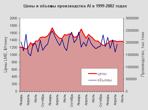 С другой стороны, важно отметить, что сейчас баланс спроса-предложения алюминия достаточно стабилен и не демонстрирует серьезных изменений. Как и в предыдущие годы, растет количество наличного металла на складах (ныне порядка 3 млн.тонн), потенциально способное существенно влиять на мировые цены, а в конечном итоге – и на реальное производство алюминия. Во многом именно биржевые механизмы «сбивают» корреляцию объемов производства с ценами алюминия на мировом рынке (см. Рис.1). Свой неблагоприятный вклад внесли и события 11 сентября 2001 в США, усугубившие кризис авиаперевозок и авиастроения. Однако в целом можно говорить о некоторой стабилизации мирового рынка алюминия в 2002 году.