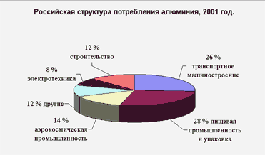 Структура потребления алюминия в России по отраслям промышленности приведена на Рис.2. (по данным на 2001 год) и во-многом является стабильной в течении последних 5 лет.