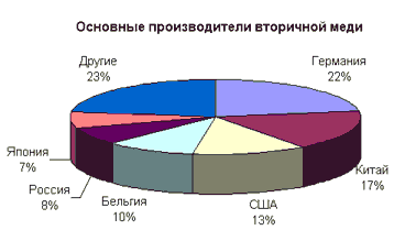 Вторичный металл имеет значительную долю в общей структуре производства меди: треть произведенной в мире меди выплавляется из вторсырья (см. График 3). Технология меди более проста, нежели технология алюминия, а кроме того, допускает большие возможности для попутной переработки вторичного металла.