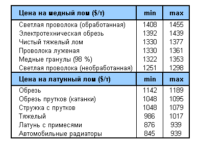 Цены на медный и латунный лом также значительно связаны с биржевыми ценами на медь (например LME) и значительно зависят от типа лома. Текущие цены приведены ниже: