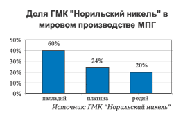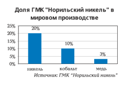 ГМК «Норильский никель» – крупнейший в мире производитель палладия, один из крупнейших производителей платины. На отечественном рынке на долю ОАО «ГМК «Норильский никель» приходится около 96% всего производимого в стране никеля, 55% меди, 95% кобальта.
