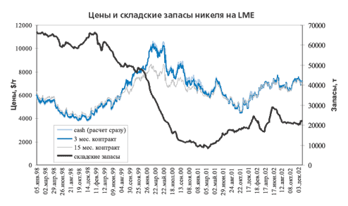 К концу 2002 года никель стал лидером по росту цен среди всех торгующихся на Лондонской бирже металлов (LME): он оказался единственным товаром на LME, текущая цена которого превысила максимум прошлого года. У этого явления три причины: рост спроса на нержавеющую сталь, связанный, главным образом, с увеличением военных закупок во всем мире, экономическое оживление стран США и Европы и объявление одного из главных производителей металла, компании «Норильский никель» (более 20% мирового производства) о проведении модернизации своих заводов и уменьшении в этом году объемов экспорта со 177 до 158 тыс.т.