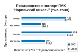 По итогам 2002 года только на ЗФ ГМК «Норильский никель» произведено 120 тыс. тонн никеля (практически на уровне 2001 года), а производство меди увеличилось на 4,6% и составило 357 тыс. тонн, причем экспорт меди уменьшился на 30 тыс. тонн. Продажи меди на внутренний рынок увеличились до 83 тыс. тонн по сравнению с 52 тыс. тонн в 2001 г.