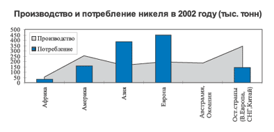 Мировой спрос на никель по итогам 2002г. может составить 1,16 млн тонн. Основной спрос придется на экономику стран «западного мира» и достигнет 1,02 млн тонн. По сравнению с 2001г. рост показателей потребления никеля составит +5,4% и +5,2%. Соотношение между производством и спросом на никель в 2002г. по основным регионам (в тыс. тонн) соответственно составит: