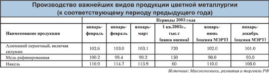 Общий прогноз Минэкономразвития для российской цветной металлургии в 2003 году составляет рост объемов производства на 4%, причем, в основном, опять же за счет никеля и драгоценных металлов.