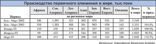Мировое производство алюминия в начале 2003 года, наконец-то, показало тенденцию к росту. Сбыт алюминия и сплавов оживился, и выпуск первичного металла в мире вырос за квартал на 4%.