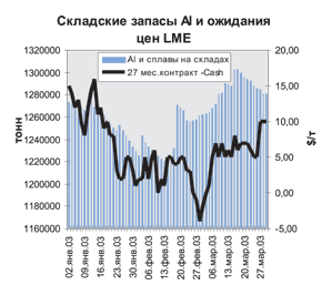 Главной, по мнению экспертов, причиной этого стало «давление» складских запасов Al и его сплавов (рост на 40% за год и на 0,6% за квартал) и новый спад авиаперевозок, вызванный войной в Ираке.