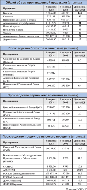По итогам первого квартала 2003 года, суммарный объем производства первичного алюминия с учетом показателей предприятий «СевЗапПрома», включенных в Группу в конце 2002 года, а также Надвоицкого алюминиевого завода, превысил уровень аналогичного периода прошлого года на 9,2 тыс. тонн (4,3%).