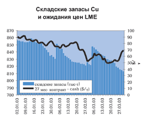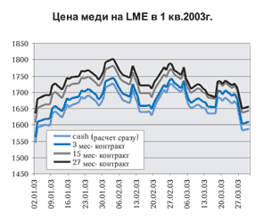 Тем не менее, уровень позитивных ожиданий по меди на 2003 год выше, чем для алюминия и многих других цветных металлов. Рост цен LME за I квартал составил +2,78%, однако ожидания трейдеров по 27-месячным контрактам выше текущих цен на 50-70 $т.