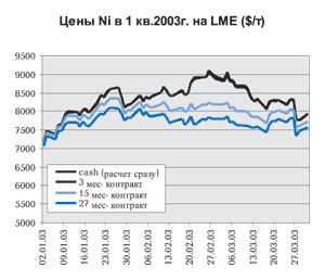 Тем не менее биржа считает, что «лучшие времена» для никеля заканчиваются. Рост складских запасов, зарегистрированных на LME, за I кв. 2003г. составил 9,3%. А ожидания по 27-месячным контрактам ниже текущих цен на 200-1200$ за тонну. Последним негативным фактором, способным снизить китайский спрос на металл, эксперты считают продолжающуюся эпидемию нетипичной пневмонии.