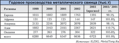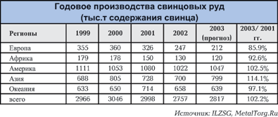 При низких ценах на свинец и растущих затратах в 2001-2002 годах произошло сокращение добычи свинца в Австралии, Ирландии, Канаде, Испании и Швеции. Производство металла в руде в мире заметно сократилось. К примеру, в 2002 году – на 9,8% по сравнению с 2001 г. Результат – возникший дефицит сырья, особенно свинцовых концентратов, продолжающийся до сих пор. Только в прошедшем году за счет Азии горнорудная отрасль заметно (на 2,1%) нарастила мировое производство свинцовых руд.