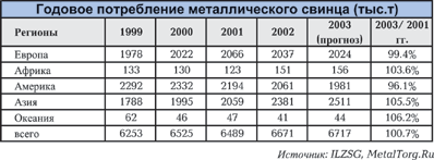 Близок к реальности и прогноз Международной группы по изучению рынка свинца и цинка (ILZSG ) о том, что «мировой спрос на свинец, составивший по итогам 2002 г. 6,6 млн. тонн, в 2003 г. может возрасти на 0,9%, а в 2004 г. еще на 2,4%».