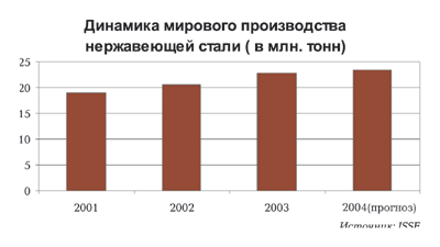 В результате, в новом 2004 году мировой рынок нержавеющей стали характеризуется опережающим ростом спроса. Несмотря на заметное снижение цен на никель за первые два месяца 2004 годы цены на нержавеющую сталь «забираются» все выше и выше. Цены февраля по сравнению с декабрем 2003 г. поднялись уже на 21%.