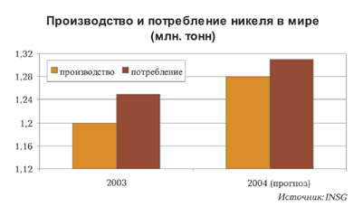 В итоге по данным различных источников («Гипроникель», Nickel Development Institute и INSG/Bloomberg) Китай увеличил в 2003 году потребление никеля на 40-53%, т.е до уровня около 134 тыс.т. Более того, Beijing Antaike International Development Co. (информационное подразделение China Nonferrous Metals Industry Association) недавно сообщила, что в конце 2003 года китайские производители нержавеющей стали продолжали накапливать запасы никеля для новых производственных линий, несмотря на рост его цен.