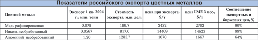 Сохранилась в 2004 году подавляющая экспортная ориентация основных производств российской цветной металлургии. За 3 месяца этого года Россия, по данным ГТК, поставила за рубеж 1 млн. 201 тыс. тонн алюминия, 78 тыс. тонн меди и 56.7 тыс. тонн никеля. Несмотря на снижение физических объемов поставок меди и никеля (на 25,7% и 4,3%), стоимостные объемы экспорта возросли на 23.4% и 87.2% соответственно.