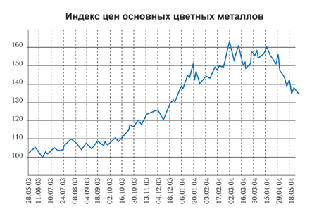 Пик цен за три первых месяца 2004 года пришелся на середину февраля. Это хорошо иллюстрирует «Индекс цен на цветные металлы» сайта www.MetalTorg.Ru, рассчитываемый по 6 основным металлам, котируемым на LME.