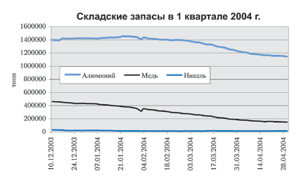 За I квартал 2004 года был отмечен спад зарегистрированных LME складских запасов практически по всем основным металлам. Аналитики отмечают, что запасы никеля на конец марта 2004 г. крайне низкие (14,7 тыс.тонн, падение на 40%). Продолжают уменьшаться также запасы меди и алюминия (падение с начала года соответственно 14% и 56%).