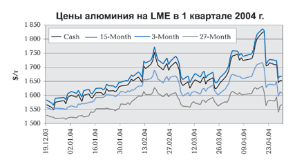 Средняя цена на алюминий в первом квартале 2004 года выросла на 14% по сравнению со среднегодовой ценой в 2003 г. Продолжался ее рост и в течение квартала. Так, если 31 декабря средняя цена на алюминий LME составляла $1428 за тонну, то на 31 марта – уже $1656 за тонну.