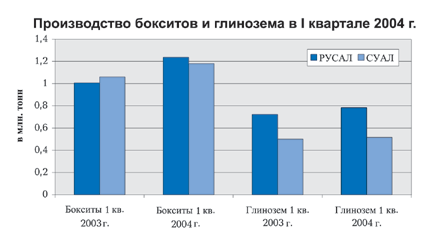 В целом в 2004 году производство бокситов и глинозема увеличилось как на РУСАЛе, так и на СУАЛе. В целом это производство по России показало рост объемов за квартал на 11,1%.