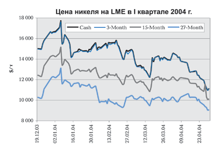 Однако рекордсмен по динамике цен 2003 года (никель) в I квартале продемонстрировал заметную тенденцию к понижениию. Так, цена по 3-х месячным контрактам с начала года упала на LME на 17%.
