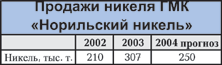 В 2004 году эти ошибки устранены, «Норникель» продает металл по мировым ценам, т.е. в среднем на 50-80% дороже, чем в прошлом году. По словам начальника управления анализа и развития рынков сбыта ГМК «Норильский никель» А. Берлина, компания намерена продать на 20% никеля меньше, чем в прошлом, – около 250 тыс. тонн. Связано это с отсутствием складских запасов и запасов металла под залог, имевшихся в прошлом году, поэтому в 2004 году будет продано столько металла, сколько будет произведено.