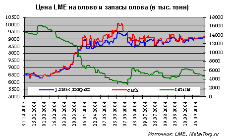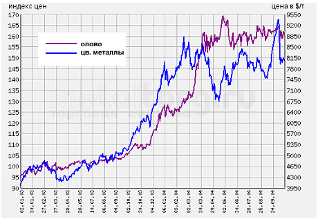 Цены на олово на фоне общего роста тоже выросли. Причем олово стало одним из лидеров по росту цен. В марте 2004 цены на олово подошли к своему историческому максимуму с 1998 года, в начале июня – превзошли его, однако далее (по сравнению с другими металлами) последовал небольшой спад. Спекулятивная игра лета и начала осени на этом рынке задела олово меньше, чем многие другие металлы. В последние 4 месяца цены на олово сравнительно стабильны и колеблются в пределах 8500-9200$ за тонну.