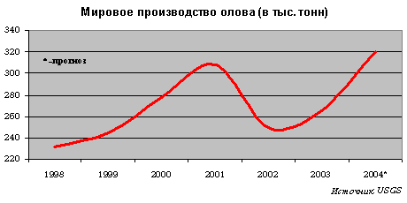 По прогнозам брокерской компании SG CIB Commodities, работающей на Лондонской бирже металлов (LME), производство олова в 2004 году увеличится на 3% и достигнет 320 тыс. тонн, но к концу года все же ожидается дефицит наличного металла на мировом рынке в 10-11 тыс. тонн. При этом мировое потребление олова скромно прогнозируется с ростом от 293 тыс. т в 2003 г. до 301 тыс. т. в 2004 г. т.е. на 2,73%. Опережающий спад запасов олова такую оценку явно не подтверждает.
