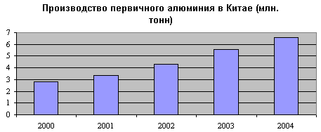 На мировом рынке алюминия влияние Китая за 2004 год выросло не меньше, чем на рынке стали. Мировое производство алюминия в прошлом году выросло в наибольшей степени именно за счет Китая. Если в 2003 году его доля в мировом производстве алюминия составила 19%, то в 2004 году она выросла до 22 %, а в конце года (декабре) - превысила 24,2%.