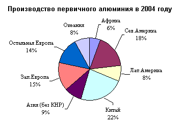 В целом в мире, по статистике Международного института алюминия (IAI), производство первичного алюминия в 2004 г. увеличилось на 6,4% и составило 29,2 млн т по сравнению с 27,45 млн т в январе-декабре 2003 г.