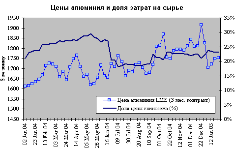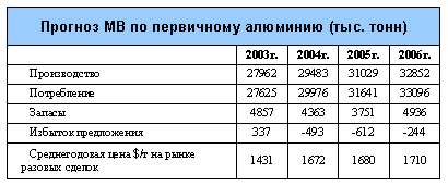 Вопреки многим прогнозам спрос на алюминий в 2004 году опередил предложение. Практически все прогнозы по его ценам не сбылись (например, среднегодовая цена 1480 $/т от Deutsche Bank или1688 $/т в MBR). Цены алюминия не упали, как ожидалось, а заметно выросли. На LME с 31.12.2003 по 31.12.2004 рост цен по трехмесячным контрактам составил 22% (с 1605.5 до 1962 $/т).