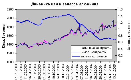 В октябре 2004 года среднемесячная цена алюминия на LME составляла $1820, то в ноябре - уже $1814 за тонну, т.е. рекордное среднемесячное значение за последние 14 лет. Еще один рекорд пал в декабре. Так, на торгах 23 декабря цена на алюминий подскочила до уровня 1916$/тонна и достигла 9-летнего максимума. Этот рост четко подкреплен снижением запасов алюминия. На складах, зарегистрированных LME, запасы алюминия в 2004 году сократились более чем вдвое (до 48,8% от уровня начала года), т.е. до 0,965 млн.тонн. Это менее, чем 10-дневный объем потребления алюминия в мире!