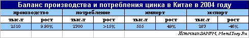 Резкий рост потребления (по разным оценкам от 11 до 25%) превратил Китай в импортера цинка. Сейчас, в начале 2005 года аналитики китайской Antaike прогнозируют, что годовой импорт превысит экспорт более, чем на $200 млн (более 170 тыс.т). Учитывая рост цен и дефицит цинка, эта цифра может оказаться вдвое больше как по объемам, так и по ценам. Собственное производство цинка в Китае продолжает оставаться недостаточным. По данным ГСУ КНР в январе 2005 года оно сократилось на 8% по сравнению с аналогичным показателем 2004 года и составило только 169,6 тыс. тонн.