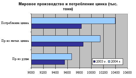 В результате за 2004 год спрос на цинк в мире вырос по разным оценкам на 5,3-5,7% (до 10,3-10,4 млн.т). Однако мировое производство металла – только на 2,9%, а мировое производство руды – только на 1,22%.