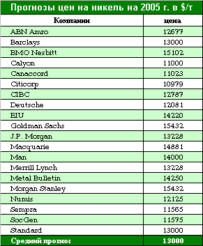 * 5 апреля 2005 года эксперты Westpac Banking Corp. пересмотрели свой прогноз и сообщили, что цены на никель в 2005 году в среднем составят 13 890 $/т.