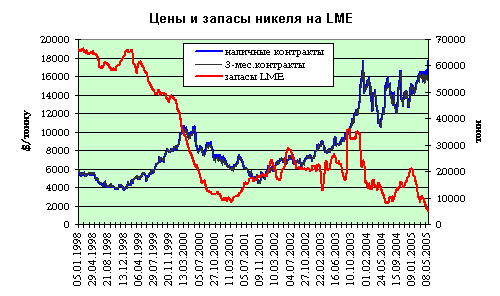 Тем временем среднемесячная цена наличного никеля на Лондонской бирже металлов (LME) в феврале 2005 года составляла 15349 $/т, в марте - 16190 $/т, в апреле - 16176 $/т. А зарегистрированные запасы металла снизились до рекордно низких 6240 тонн (-30% к началу года). Итог 1 квартала 2005 года – 16% рост цен на никель к среднему уровню прошлого года и полное опровержение подавляющего большинства прогнозов. Более того к 12 мая цены на никель по наличным контрактам взлетели до 17750 $/т, а запасы его снизились до 5028 тонн, т.е. 2-3х дней (!) мирового потребления металла. Это более, чем рекорд, причем крайне далекий от многочисленных оценок рынка никеля, приведенных выше.