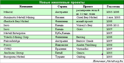 Все они намечены на ввод не ранее не ранее конца 2005 года (см. Табл.1). А значит дефицит никеля на рынке пока преодолен не будет.