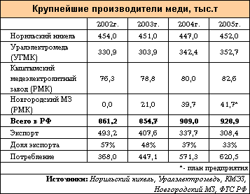Третий крупный игрок на рынке – РМК – также наращивает объемы производства (в 2005г. на 4%), занимая уже 13,3% российского рынка рафинированной меди.