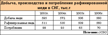 Если учесть в суммарных данных ICSG по СНГ заметное производство меди в Казахстане, составлявшее в 2005 г. – 419 тыс.тонн, в 2004 году – 443 тыс.тонн, то на долю России остается почти ничего!