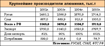 Крупнейшими мировыми компаниями-производителями алюминия являются российские РУСАЛ и СУАЛ. С 2003г. консолидация этой отрасли в России завершена и других независимых производителей первичного алюминия в стране нет. Отметим, что после многих лет информационной закрытости обе компании наращивают свою деятельность (включая финансовую) за рубежом и начали публиковать свою статистику.